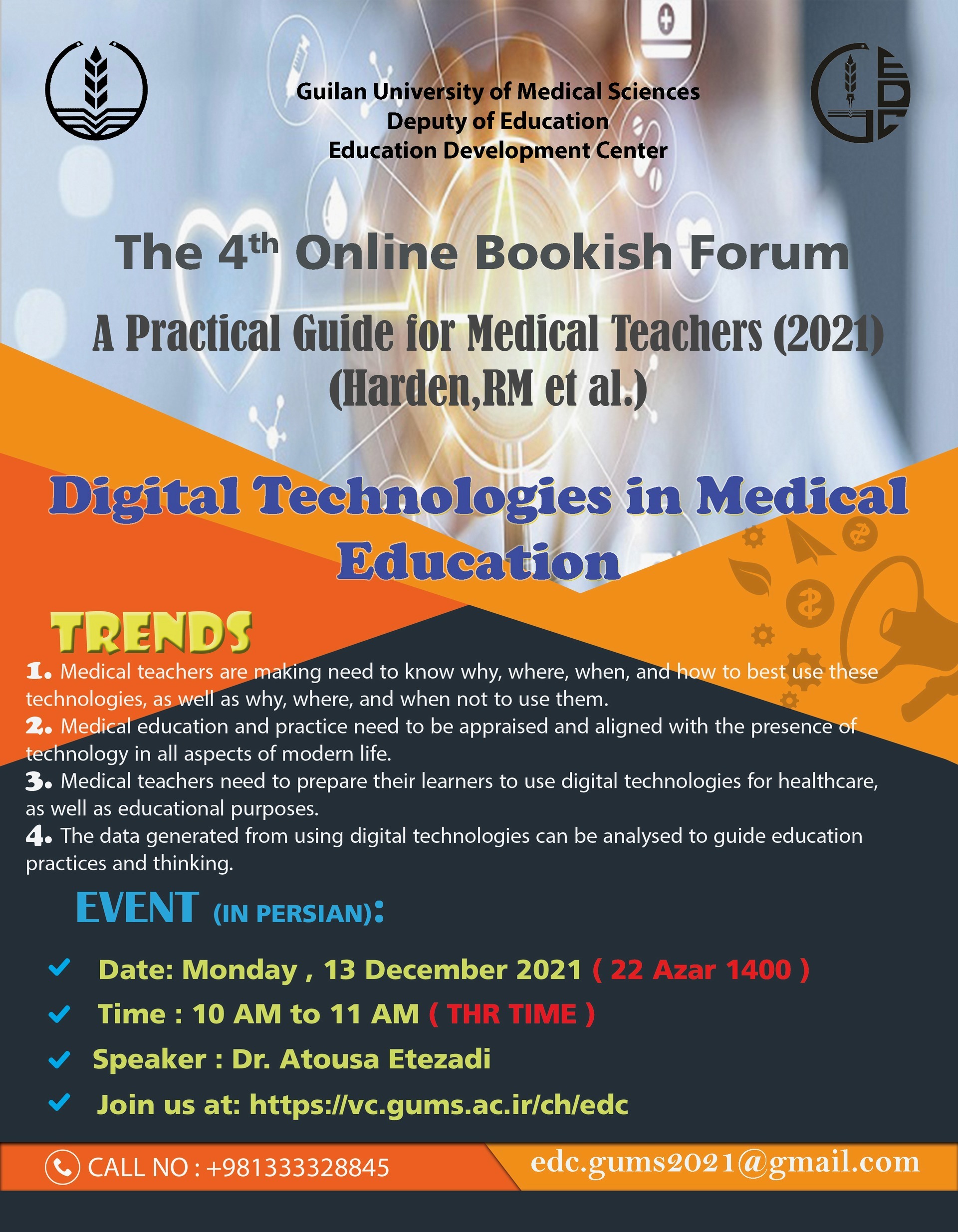 معاونت آموزشی دانشگاه علوم پزشکی گیلان، چهارمین وبینار از سلسله وبینارهای آموزشی "Online Bookish Forum" را در تاریخ 22 آذرماه سال جاری برگزار می کند.